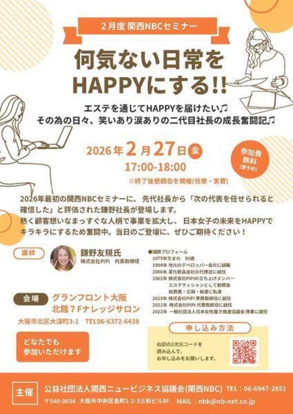 ニュース&トピックス 【告知】 お知らせ 2024.4. 1 「起業」という生き方を選択肢に 起業家教育プ 詳しく見る お知らせ 2026.1. 1 令和8年 年頭所感 詳しく見る お知らせ 2026.1. 1 年頭のごあいさつ 詳しく見る イベント 2025.12.22 何気ない日常をHAPPYにする!! 詳しく見る 一覧はこちら 活動レポート 2025.12.19 未来のチカラ育成委員会 出前講義「16歳から 詳しく見る 2025.12.18 関西NBCフェスタ実行委員会コアメンバー打合 詳しく見る 一覧はこちら 行政・諸団体からの支援策 2025.11. 4 近畿経済産業局からのお知らせ 令和7年度 冬 詳しく見る 一覧はこちら 事務局のひとりごと 2025.12.10 盛り上がりました 詳しく見る 一覧はこちら